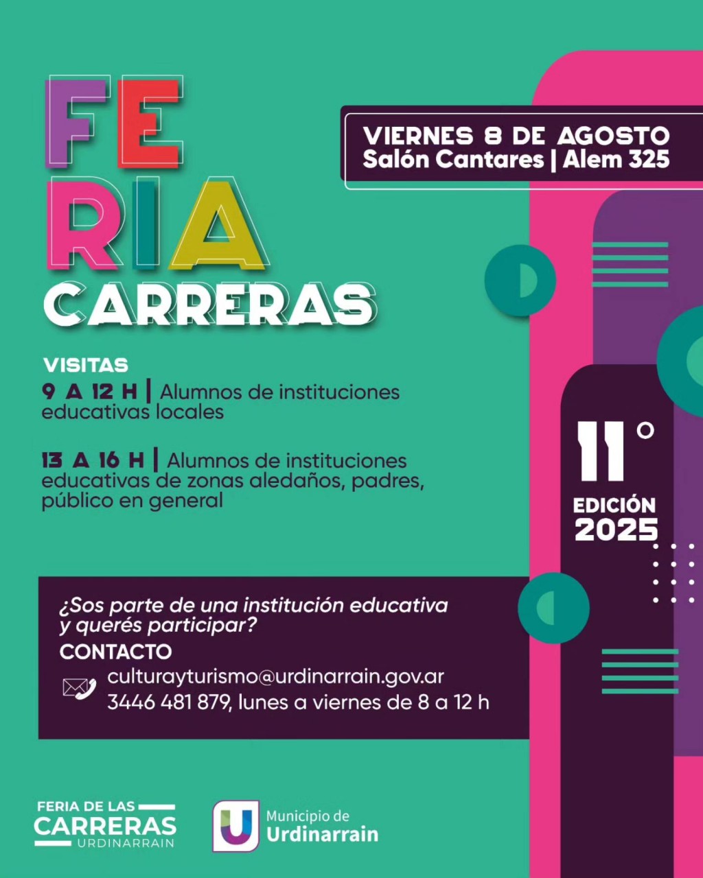El viernes 8 de agosto, en el salón Cantares, llega la 11° edición de la Feria de las Carreras de Urdinarrain. Estudiantes, y público en general podrán recorrer los distintos stands y conocer toda la oferta educativa en este evento que visibiliza las carreras terciarias y universitarias de nuestra ciudad y la región.