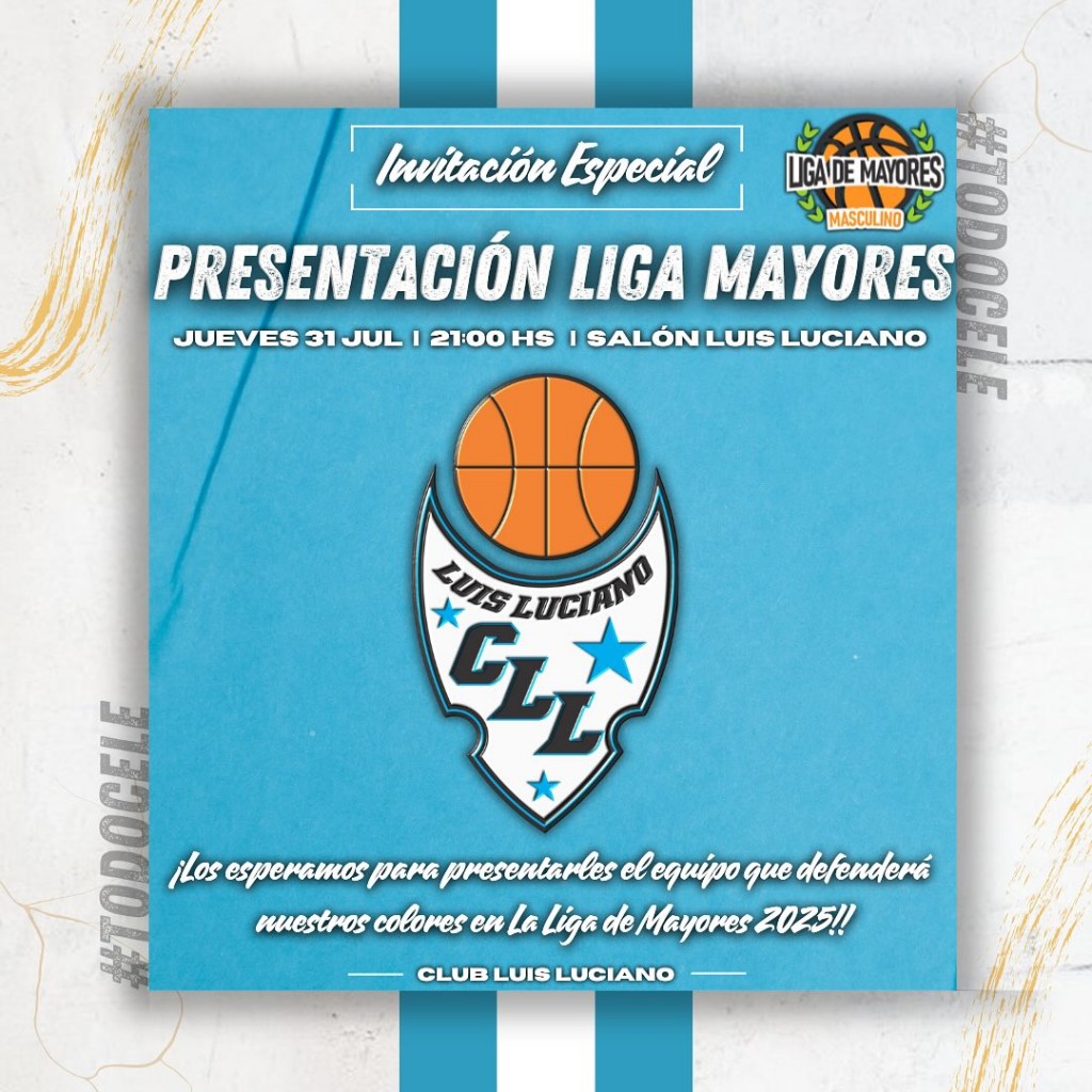 Desde la presidencia del Club Social y Deportivo Luis Luciano, recibimos la invitación para este Jueves 31 del corriente, a las 21 hs. en las instalaciones de nuestro club, a la PRESENTACION de el EQUIPO DE PRIMERA DIVISION, de la Institución, de cara al Torneo Pre Federal 2025, organizado por la Federación de Básquet de Entre Ríos (FBER).