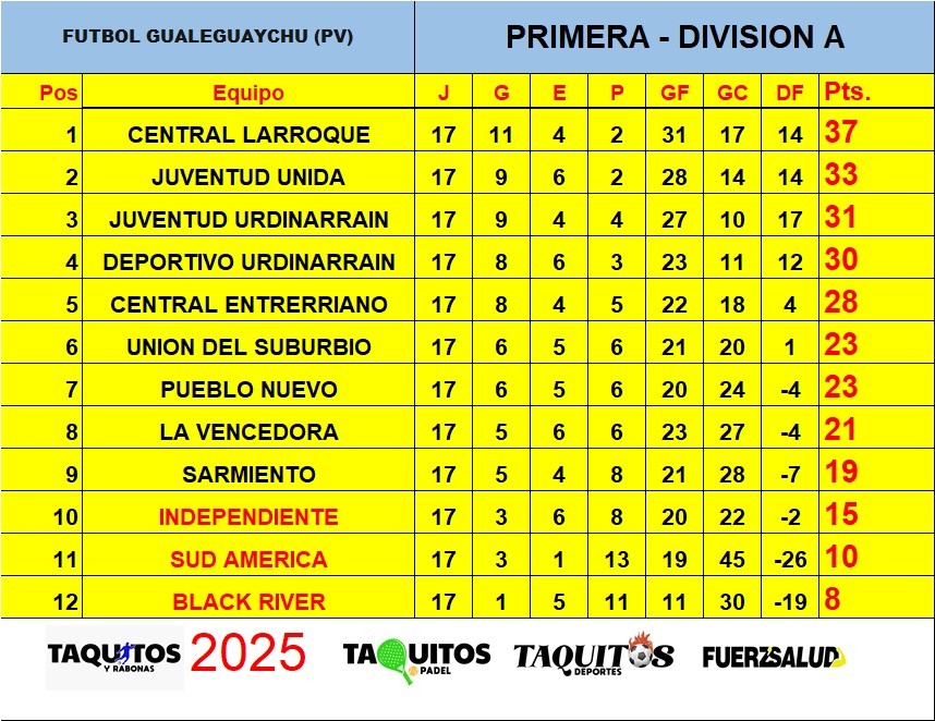Por la 17ª fecha del torneo José “Toto” Gallop Juventud Urdinarrain goleó a Pueblo Nuevo por 5 a 1 - Central Larroque venció de visitante a Sud America 2 a 1 - Juventud Unida derrotó a La Vencedora 2 a 0 y Deportivo cayó en el ultimo minuto por 1 a 0