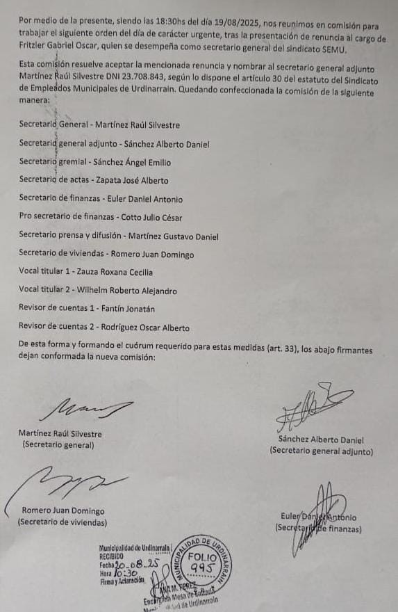 A las 18:30hs del día 19/08/2025, se reúne la comisión para trabajar el siguiente orden del día de carácter urgente, tras la presentación de renuncia al cargo de Fritzler Gabriel Oscar , quien se desempeña como secretario general del sindicato SEMU (Sindicato de Empleados Municipales Urdinarrain).
