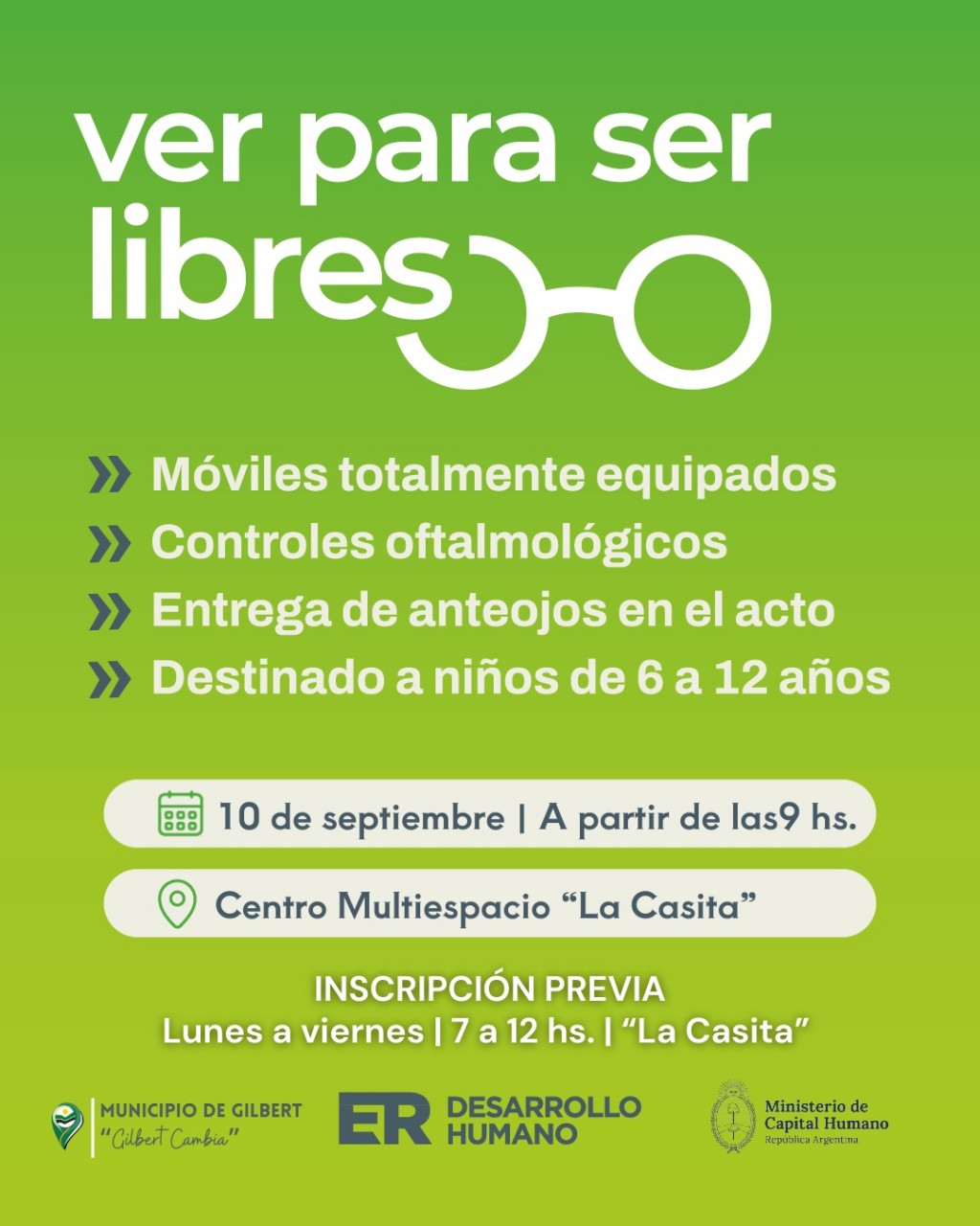El Ministerio de Desarrollo Humano de Entre Ríos, en articulación con el Ministerio de Capital Humano de la Nación, llevará adelante el programa oftalmológico “Ver para ser libres” en nuestra localidad, el próximo 10 de septiembre, con atención a niños y niñas de entre 6 y 12 años.