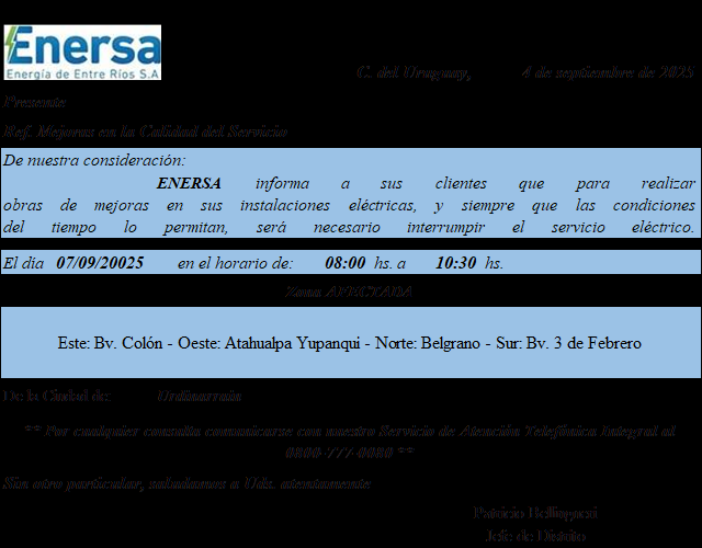 ENERSA a traves de la empresa Mantelec, estará llevando a cabo un corte de energia por dos horas y media en una zona de la ciudad delimitada a los efectos de realizar mejoras en las instalaciones electricas.