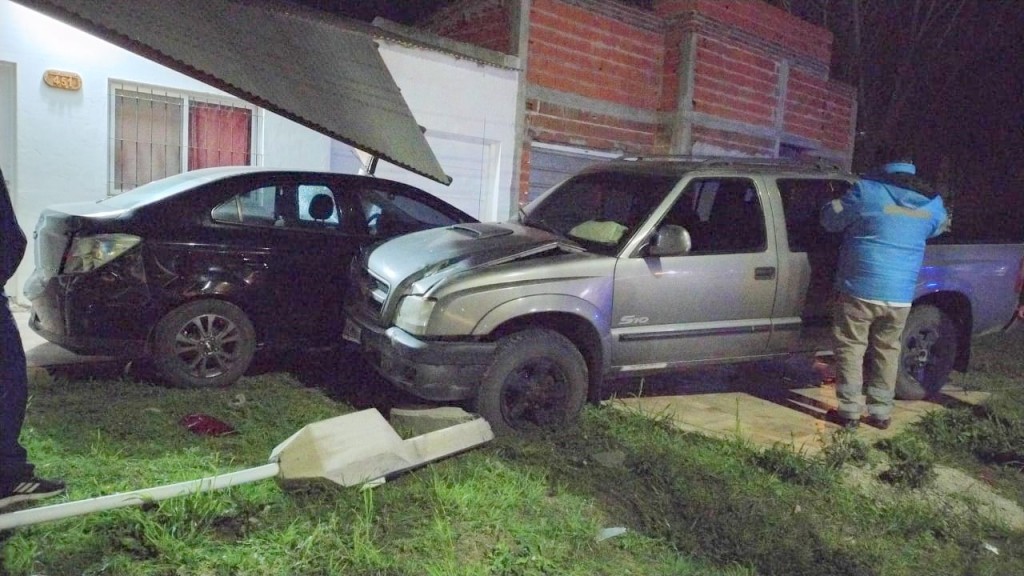 En el lugar, una camioneta Chevrolet S10 impactó de frente contra el frente de una vivienda. A su paso, derribó un pilar de luz y luego colisionó con un automóvil Chevrolet Prisma que estaba estacionado en la galería de la casa, causando serios daños materiales.
