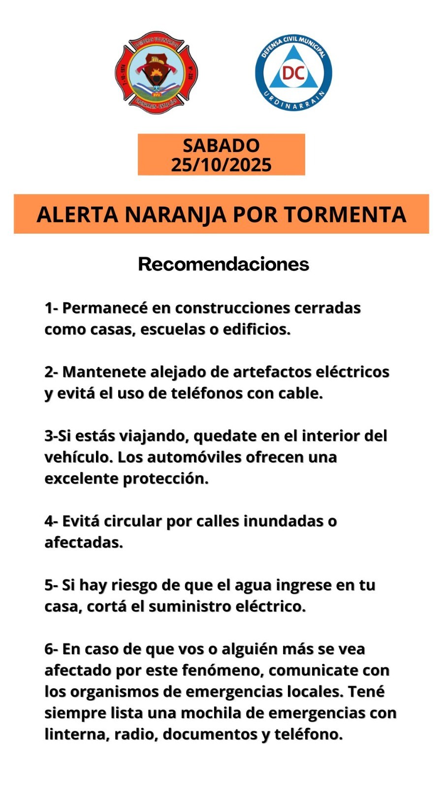 Desde la madrugada de este Viernes 24 hasta las 23 hs se registraron 75 mm en Urdinarrain. Ahora Defensa Civil de Urdinarrain a traves de un comunicado informó sobre ALERTA NARANJA para la madrugada o mañana del sábado 25
