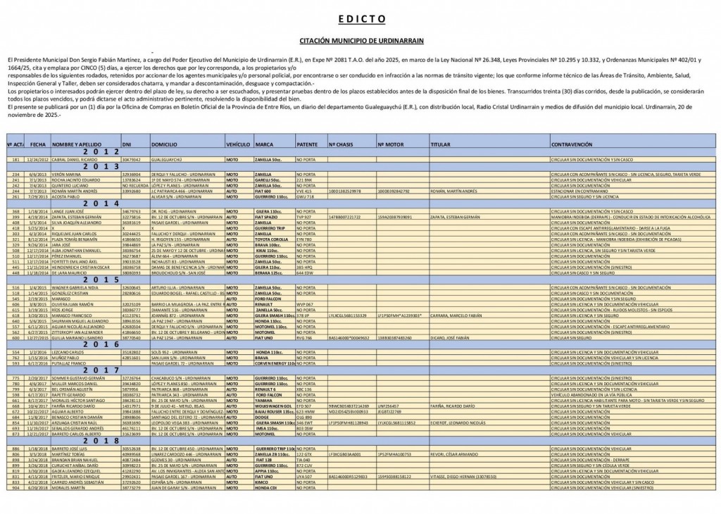 El Presidente Municipal Sergio Fabián Martínez, a cargo del Poder Ejecutivo del Municipio de Urdinarrain (E.R.), en Expe Nº 2081 T.A.O. del año 2025, en marco de la Ley Nacional Nº 26.348, Leyes Provinciales Nº 10.295 y 10.332, y Ordenanzas Municipales Nº 402/01 y 1664/25, cita y emplaza por CINCO (5) días, a ejercer los derechos que por ley corresponda, a los propietarios y/o