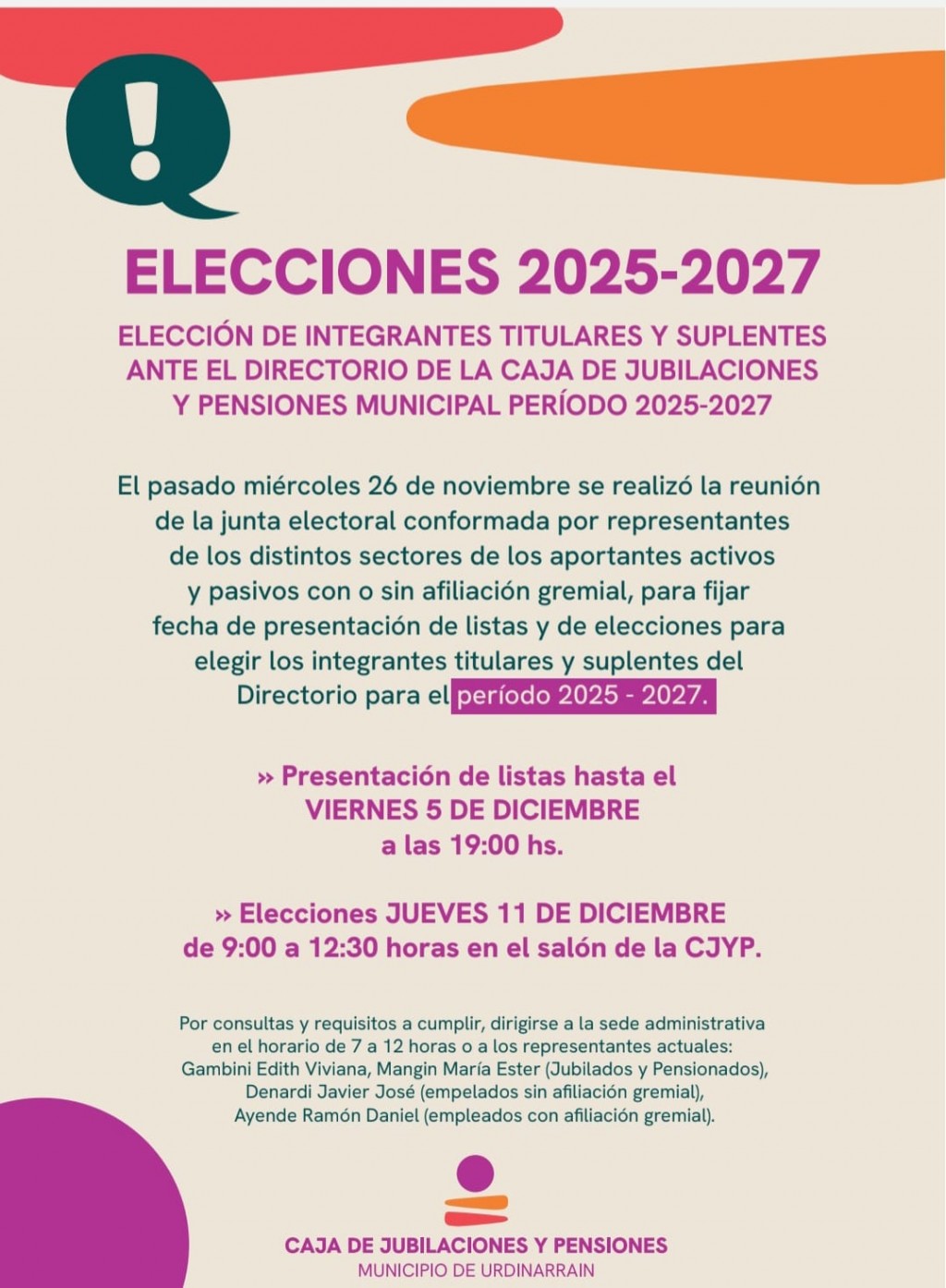El Directorio de la Caja de Jubilaciones y Pensiones Municipal, informa que el miércoles 26 de noviembre, a las 11:00 horas, se realizó la reunión de la junta electoral conformada por representantes de los distintos sectores de los aportantes activos y pasivos con o sin afiliación gremial, a los efectos de fijar fecha de presentación de listas y de elecciones para elegir los integrantes titulares y suplentes del Directorio de este organismo para el periodo 2025 - 2027.