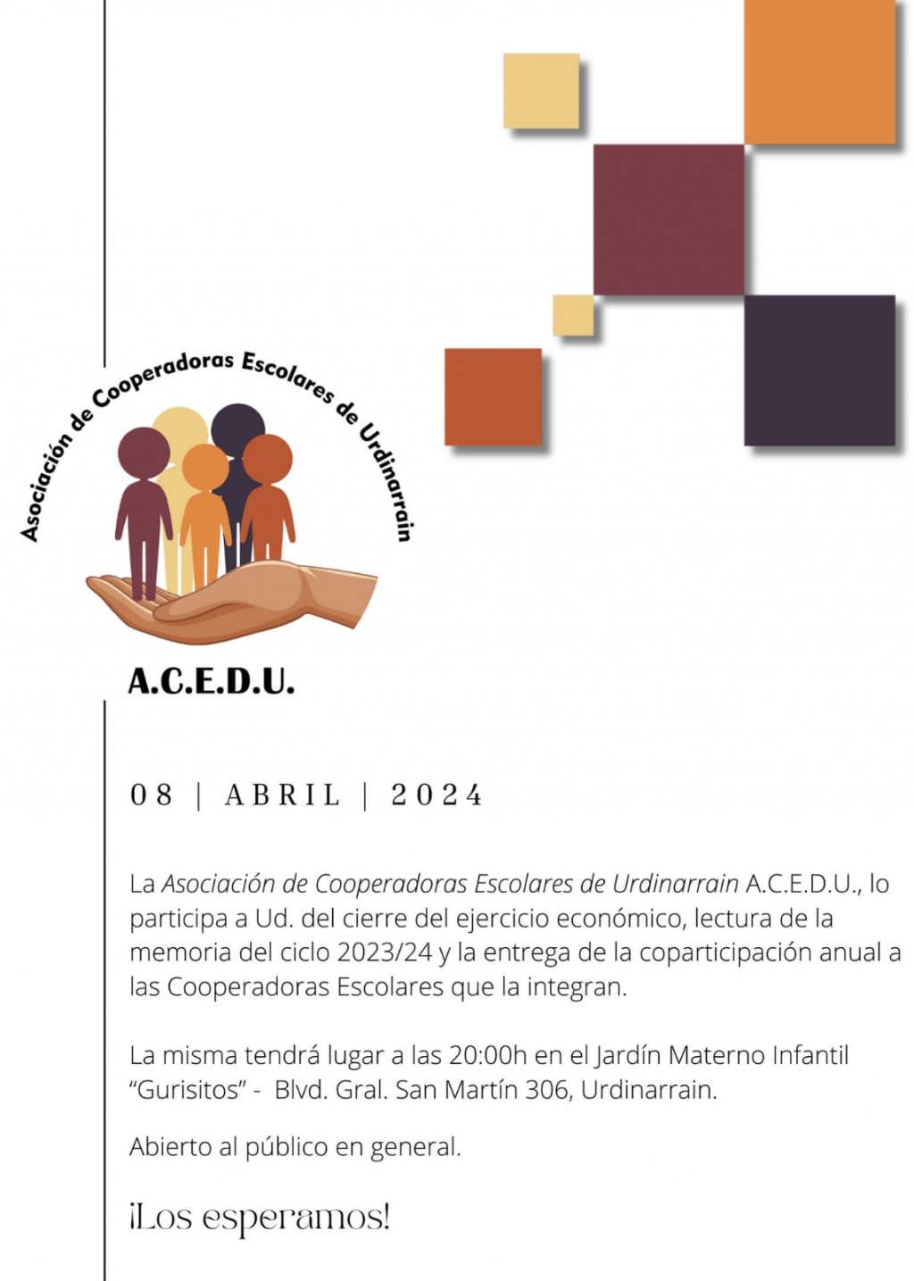 La Asociación Cooperadoras Escolares de Urdinarrain A.C.E.D.U., comunica que el dia 8 de Abril a partir de las 20 hs en el Salón del Jardin Materno Infnatil Gurisitos de Urdinarrain, Bv San Martin 306, se estará informando el cierre de ejercicio económico, lectura de la memoria del ciclo 2023/2024 y la entrega de la Coparticipación Anual a las Cooperadoras Escolares que la integran.