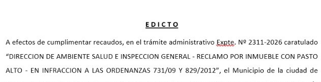 A efectos de cumplimentar recaudos, en el trámite administrativo Expte. Nº 2311-2026 caratulado “DIRECCION DE AMBIENTE SALUD E INSPECCION GENERAL - RECLAMO POR INMUEBLE CON PASTO ALTO - EN INFRACCION A LAS ORDENANZAS 731/09 Y 829/2012”, el Municipio de la ciudad de Urdinarrain (E.R.), cita y emplaza por cinco (5) días al señor  PEREYRA FRANCISCO, sus sucesores y/o herederos y/o quienes se consideren con derechos sobre el inmueble ubicado en calle Bvar.  San Martin 467,  de la ciudad de Urdinarrain (Entre Ríos), Partida Provincial Nº 159151, que se encuentra con yuyales y malezas en exceso entre otros, configurando un ámbito que facilita el desarrollo de roedores e insectos, siendo además molesto para el vecindario, ello en contravención ó infracción al Art. 1º de la Ordenanza Nº 731/09, para que proceda a la limpieza del mismo, bajo formal apercibimiento de hacerlo a su exclusivo costo y cargo -sin perjuicio de la aplicación de las multas que establecen las Ordenanzas Municipales vigentes citadas y proceder al cobro por la vía de apremio fiscal. La presente implica además emplazamiento, para que efectúe el correspondiente descargo y ofrezca la prueba que hagan a su derecho -art. 45º del Código Municipal de Faltas.- Publíquese por un (1) día. Urdinarrain, 28 de Noviembre de 2025. (Fdo. Mg. Pierina A. Rodriguez Dirección de Ambiente Salud e Inspección General).-----------------------------------