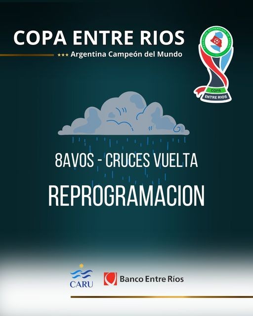 Puede ser una imagen de texto que dice "Avos. COPA ENTRE RIOS Argentina Campeón del Mundo Cuartos 8 Avos. Cuartos Semis Semis VS ENTRE RIOS 1 VS w.) Final El mejor ubicado en la tabla general es local en partido de vuelta ~ CARU Banco Entre Ríos"