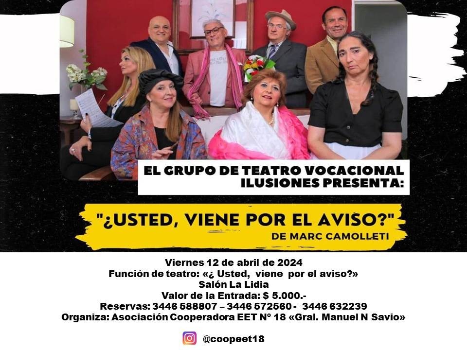 La Cooperadora de la EET Nº 18 Gral. Manuel N. Savio organiza una gran velada teatral el Viernes 12 de abril, Salón La Lidia , 21 horas, Presentación de la comedia “¿Usted, viene por el aviso? - Grupo de Teatro Vocacional “Ilusiones”