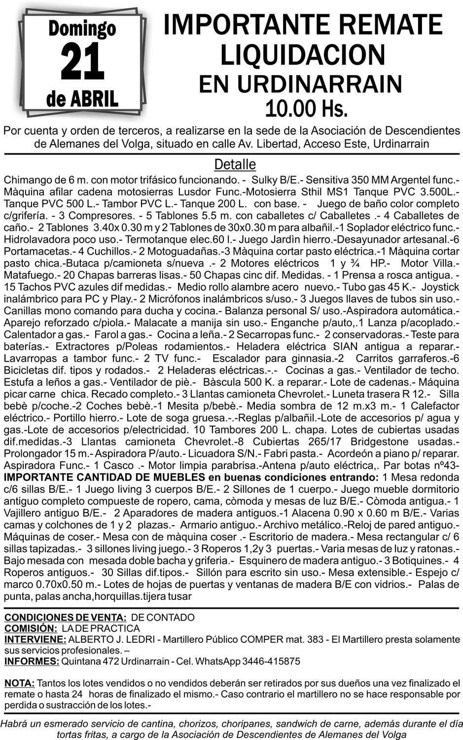 El Domingo 21 de abril a partir de las 10 hs se estará llevando a cabo el anunciado remate liquidación en la sede de la Asociación Alemanes del Volga,