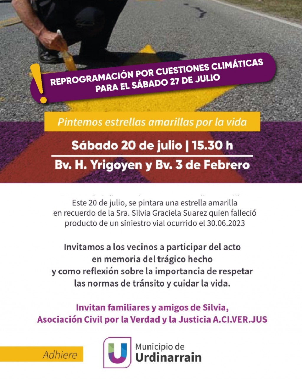 Este sábado 27 de julio (reprogramada) se pintará una estrella amarilla por la Sra. Silvia Graciela Suarez, quien perdió la vida producto de un accidente de tránsito ocurrido el 30 de junio de 2023.