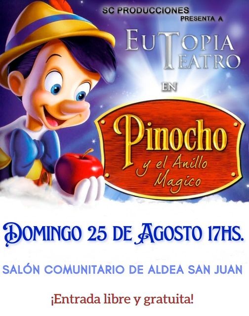 En el Mes de las Infancias, Llega desde Gualeguaychú. "Pinocho y el Anillo Mágico" Obra teatral para toda la familia, el Domingo 25 de Agosto - 17 hs - Salón Comunitario Aldea San Juan