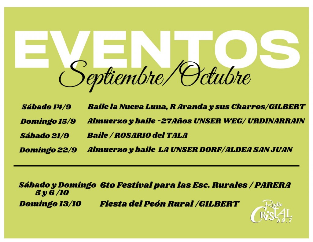 Aqui le ofrecemos el cronograma de Eventos que tenemos en Radio Cristal, tanto en Urdinarrain como en localidades aledañas. Recordando que para Noviembre tenemos la Fiesta de la Tradición y en Diciembre LA PREVIA de la Fiesta del Caballo 2025