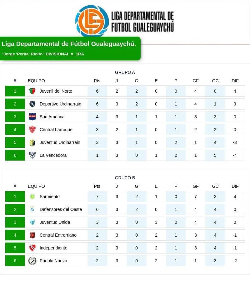 CANCHA CENTRAL LARROQUE. SUB23 CENTRAL LARROQUE VS SUD AMERICA. 1RA CENTRAL LARROQUE: 8 VS SUD AMERICA: 0 JUEVES 10 DE OCTUBRE. CANCHA CENTRAL ENTRERRIANO. 19:30hs SUB23 CENTRAL ENTRERRIANO VS SARMIENTO. 21:30hs 1RA CENTRAL ENTRERRIANO: 0 VS SARMIENTO; 1 CANCHA PUEBLO NUEVO. 20:00hs SUB23 PUEBLO NUEVO VS INDEPENDIENTE. 22:00hs 1RA PUEBLO NUEVO: 0 VS INDEPENDIENTE: 0 CANCHA JUVENTUD URDINARRAIN. 19:00hs SUB23 JUVENTUD URDINARRAIN: 3 VS LA VENCEDORA: 3 21:00hs 1RA JUVENTUD URDINARRAIN: 2 VS LA VENCEDORA: 0