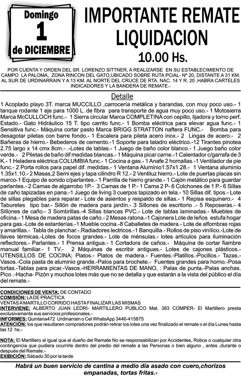 Alberto Juan Ledri, martilleró público estrá llevando a cabo el Domingo 1 de Diciembre un remate Liquidación por cuenta y Orden de Lorenzo Sittner en Rincon del Gato, establecimiento La Paloma