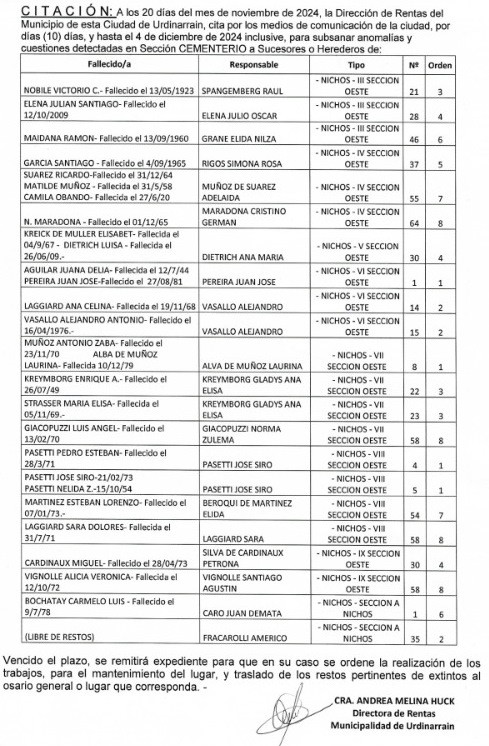 A los 20 días del mes de NOVIEMBRE de 2024, la Dirección de Rentas del Municipio de Urdinarrain, cita por los medios de Comunicación de la ciudad, por 10 días (10) y hasta el 04 de DICIEMBRE de 2024 inclusive, para subsanar anomalías y cuestiones detectadas en Sección CEMENTERIO a Sucesores y herederos de: