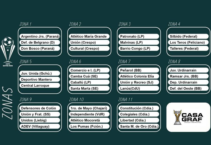 En la tarde noche de este jueves la Federación Entrerriana de Fútbol llevó a cabo el sorteo de la Copa Entre Rios 2024-2025. Fueron 39 los clubes que participan, distribuidos en 5 zonas de 4 y 5 zona de 3 equipos.