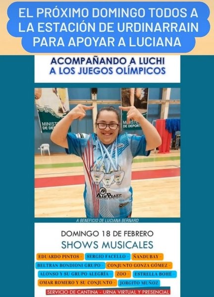 Este Domingo 18, vamos todos al predio de la estación de Urdinarrain para ayudar a que Luciana pueda viajar a los JJOO Trisome Games 2024, que van a realizarse en Antalya, Turquía, del 16 al 26 de marzo.  Todos juntos podemos hacer que se haga realidad si nos unimos y damos nuestro apoyo.
