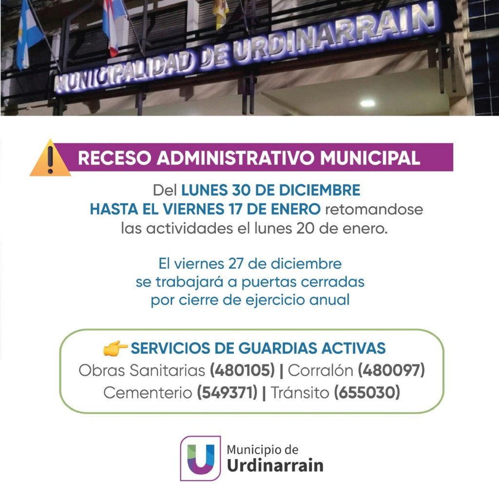 Desde el Municipio de Urdinarrain, se informa que el receso administrativo municipal será desde el día lunes 30 de diciembre hasta el 17 de enero 2025, retomando sus actividades con normalidad el lunes 20 de dicho mes.