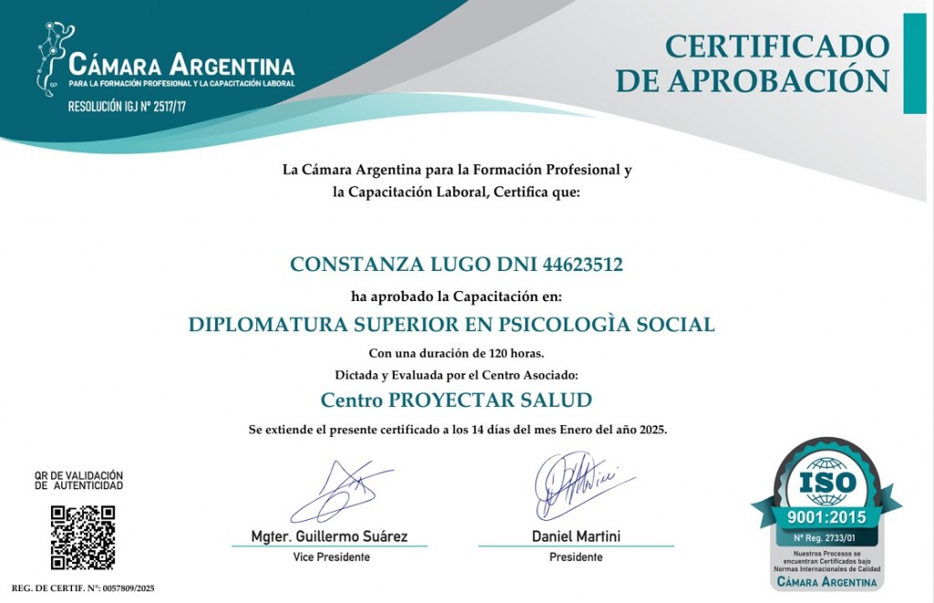 Dias pasados Constanza Lugo recibió los correspondientes titulos certificado de Diplomatura Superior en Psicología Social, en el Centro PROYECTAR SALUD, de la Cámara Argentina para la Formación Profesional y la Capacitación Laboral