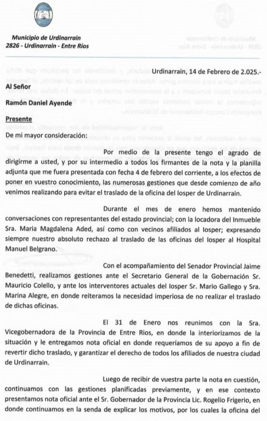 Se informa a los afiliados a IOSPER, y comunidad en general, que el Sr. Presidente Municipal ha respondido mediante nota, manifestando su apoyo a la solicitud, mediante petitorio de los afiliados, elevado a las autoridades del Instituto de la Obra Social de la Provincia de Entre Ríos, para que las oficinas locales de la obra social no sean trasladadas al Hospital Manuel Belgrano.