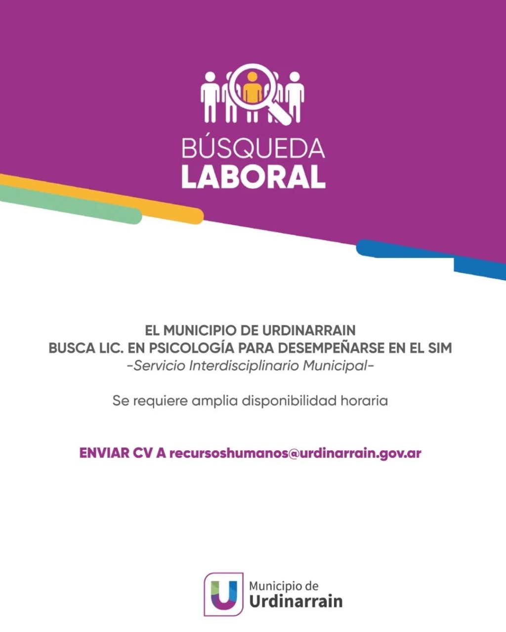 El Municipio de Urdinarrain busca a la Lic. en Psicología para desempeñarse en el SIM (Servicio Interdisciplinario Municipal). Las personas interesadas deberán enviar CV, al mail: [email protected]