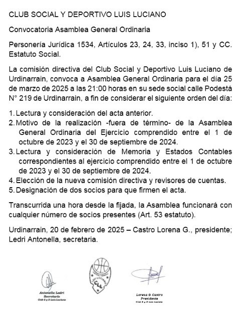 La comisión directiva del Club Social y Deportivo Luis Luciano de Urdinarrain, convoca a Asamblea General Ordinaria para el día 25 de marzo de 2025 a las 21:00 horas en su sede social calle Podestá N° 219 de Urdinarrain, a fin de considerar el siguiente orden del día: