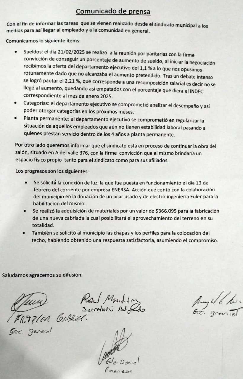 Comunicado de Prensa del Sindicato de Empleados Municipales Urdinarrain