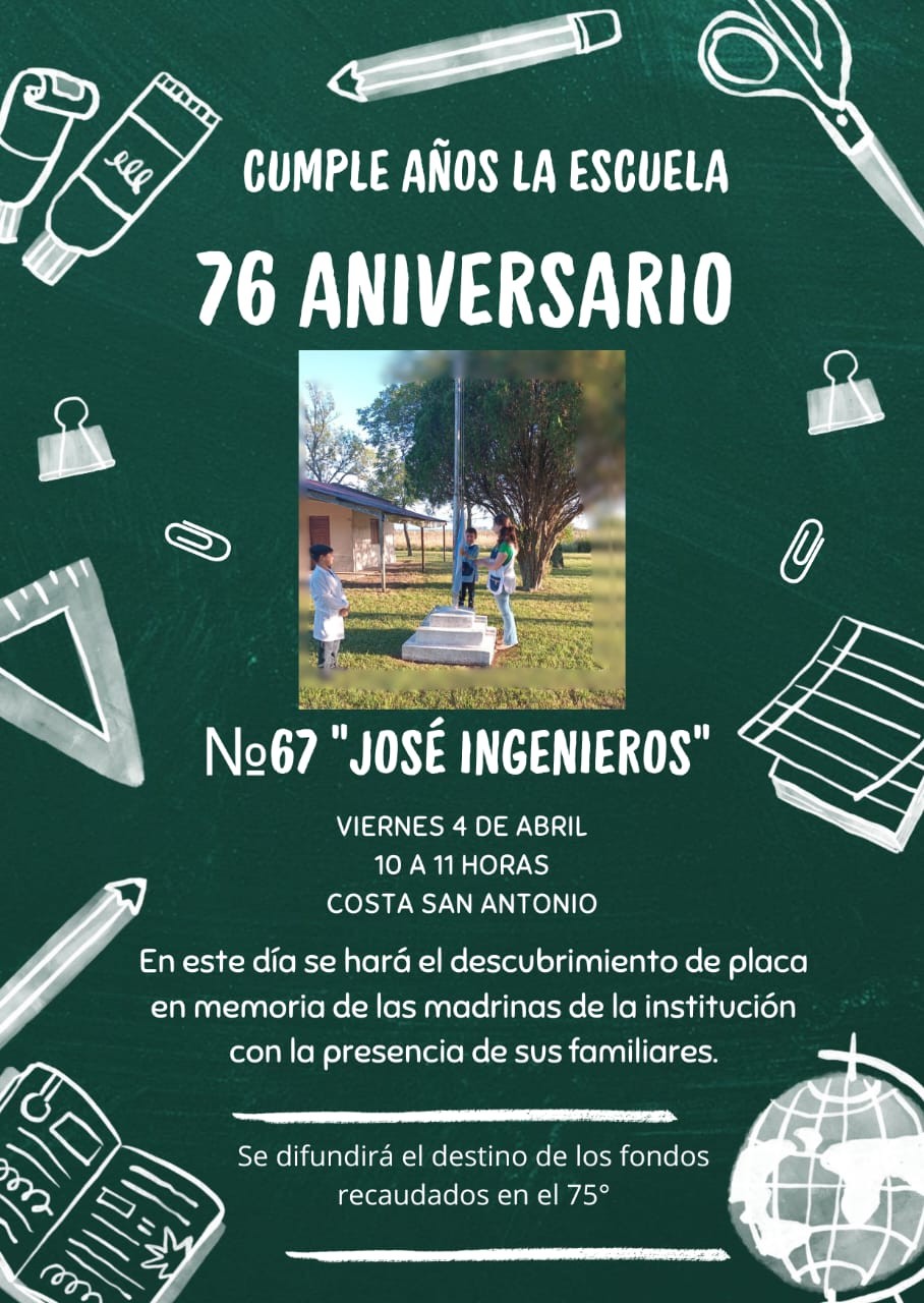 Este viernes 4 de Abril en Costa Sanm Antonio (Dpto Gchu) están de Fiesta. La Escuela Rural Jose Ingenieros cumple 76 años y los festejan de 10 a 11 hs, con un acto donde se descubrirá una placa en memoria de las madrinas de la Insttitución