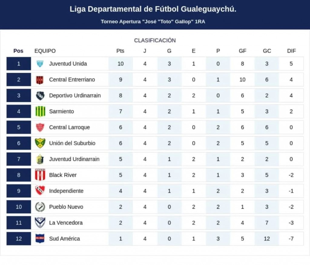 El domingo 6 de abril se disputó integramente la cuarta fecha del Apertura con poca suerte para Deportivo y Juventud Urdinarrain, que resignaron puntos, mientras que Juventud Unida y Central Entrerriano ganaron y estan en lo mas alto de la tabla.