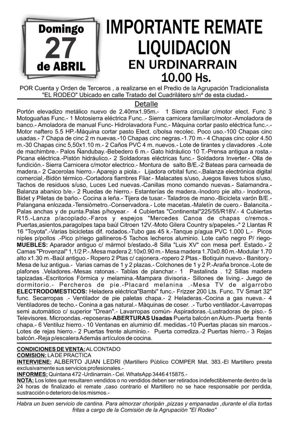 Alberto Tito Ledri anuncia que el Importante REMATE LIQUIDACION previsto para el 13, fue POSTERGADO PARA EL DOMINGO 27 DE ABRIL, a llevarse a cabo en Predio El Rodeo Urdinarrain, por cuenta y orden de terceros, a llevarse a cabo a partir de las 10 de la mañana. Ver DETALLE AQUI