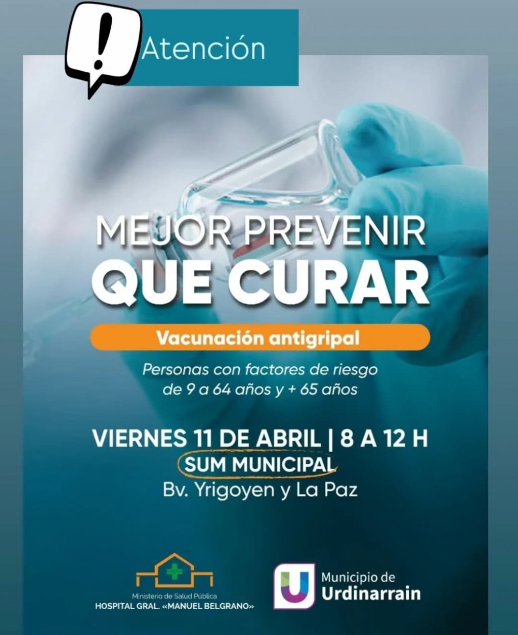De 8 a 12 hs se estará VACUNANDO con la ANTIGRIPAL a personas de 9 a 64 años con factores de riesgo (presentando certificado médico) y a los mayores de 65 años, solo con el DNI. Las vacunadoras del Hospital Belgrano estarán en el salón de Usos Múltiples que tiene el Municipio en Bv Irigoyen y La Paz