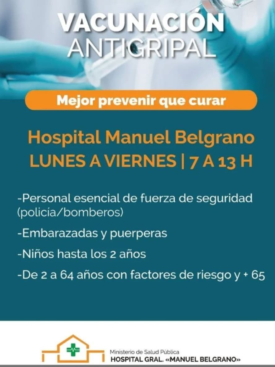 El Hospital Manuel Belgrano informa que se esta llevando a cabo la vacunación ANTIGRIPAL en forma normal todos los dias de Lunes a Viernes de 07 a 13 hs.