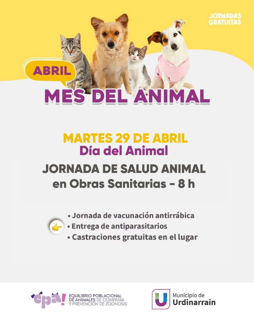 Este martes 29 de abril, Día del Animal, y lleva tu mascota a la nueva jornada que se realizará en Obras Sanitarias a partir de las 8 hs. En esta nueva jornada de Salud Animal, junto al equipo de EPA y personal municipal, se realizarán castraciones, se aplicaron vacunas antirrábicas y se entregaron antiparasitarios a perros, perras, gatos y gatas