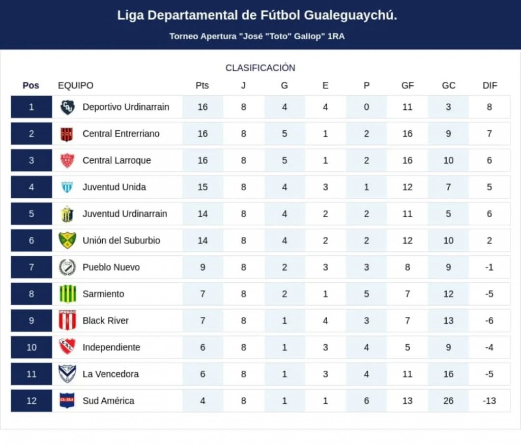 Se disputó la 8va fecha y cuando faltan 2 fechas para finalizar la primera ronda, entre Deportivo (primero) y Juventud Urdinarrain y Union (quinto y sexto) solo lo separan dos puntos. Y lo más apasionante que justamente el próximo fin de semana chocan en el JJ Stauber Juventud y Deportivo.