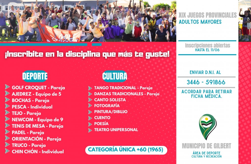 A fines de definir las fechas y condiciones reglamentarias de las instancias departamentales de los "Juegos Deportivos y Culturales Entrerrianos para Adultos Mayores". Pueblo Belgrano albergará las finales departamentales el día 11 de Julio, quedando a criterio del Área de Deportes, la realización de una instancia local en caso de ser necesario. Inscribite en la disciplina que más te guste comunicandote al 3446 591866 y acorda para retirar la ficha médica.